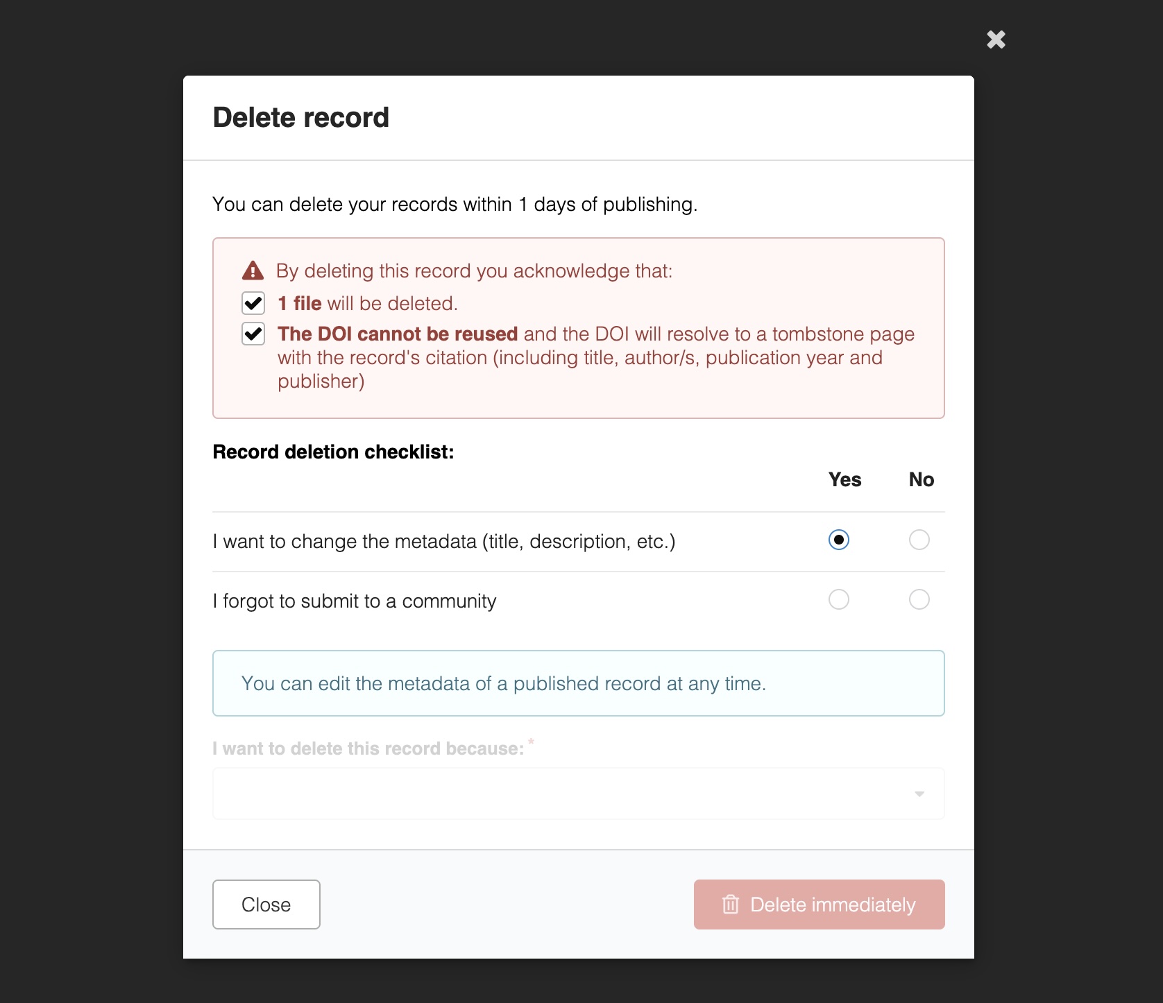 - Are aware of a common misconception which usually leads users to delete their records. For example, users who forget to submit to a community before publishing and think that they have to delete and resubmit.